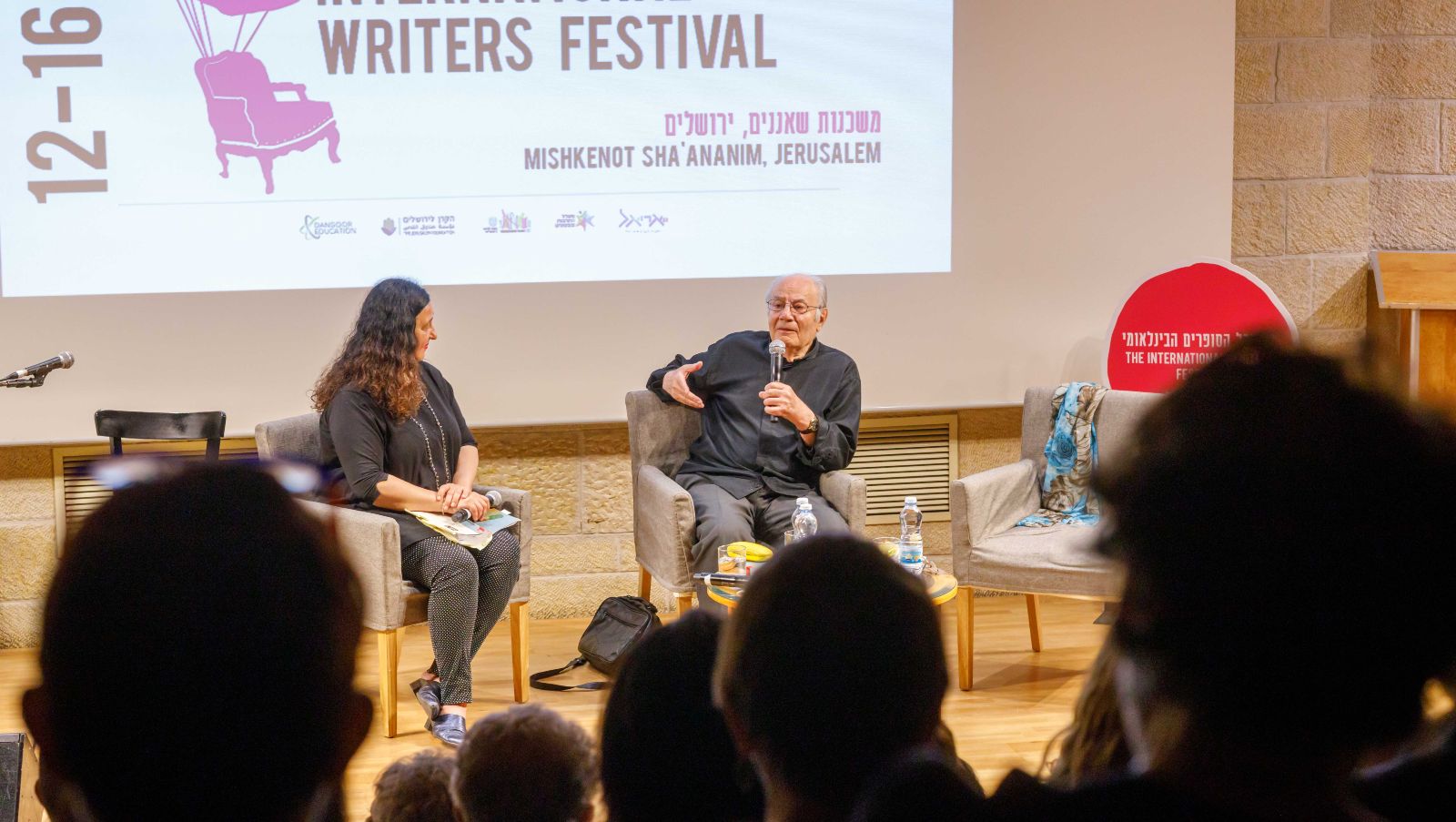 The walls of the Old City peek behind an event at a previous edition of the Jerusalem Writers Festival. Photo by Eliyahu Yannai