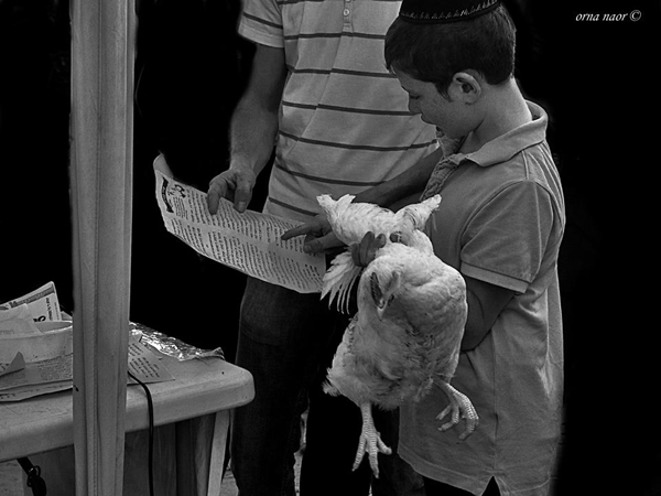 Photographer Orna Naor went out last week on the night before Yom Kippur to document the ritual and the people who practice it still. The result is an arresting photo-essay that presents a range of realities: a photo op for the secular Israeli press interested in snapping shots of what they will convey to the general public as a barbarism devoid of meaning, the mystical sense of those who do believe their sins can be transmuted through prayer and vicarious sacrifice, and the practicalities of performing a centuries-old rite on the eve of the holiest day of the Jewish calendar in the year 5774.