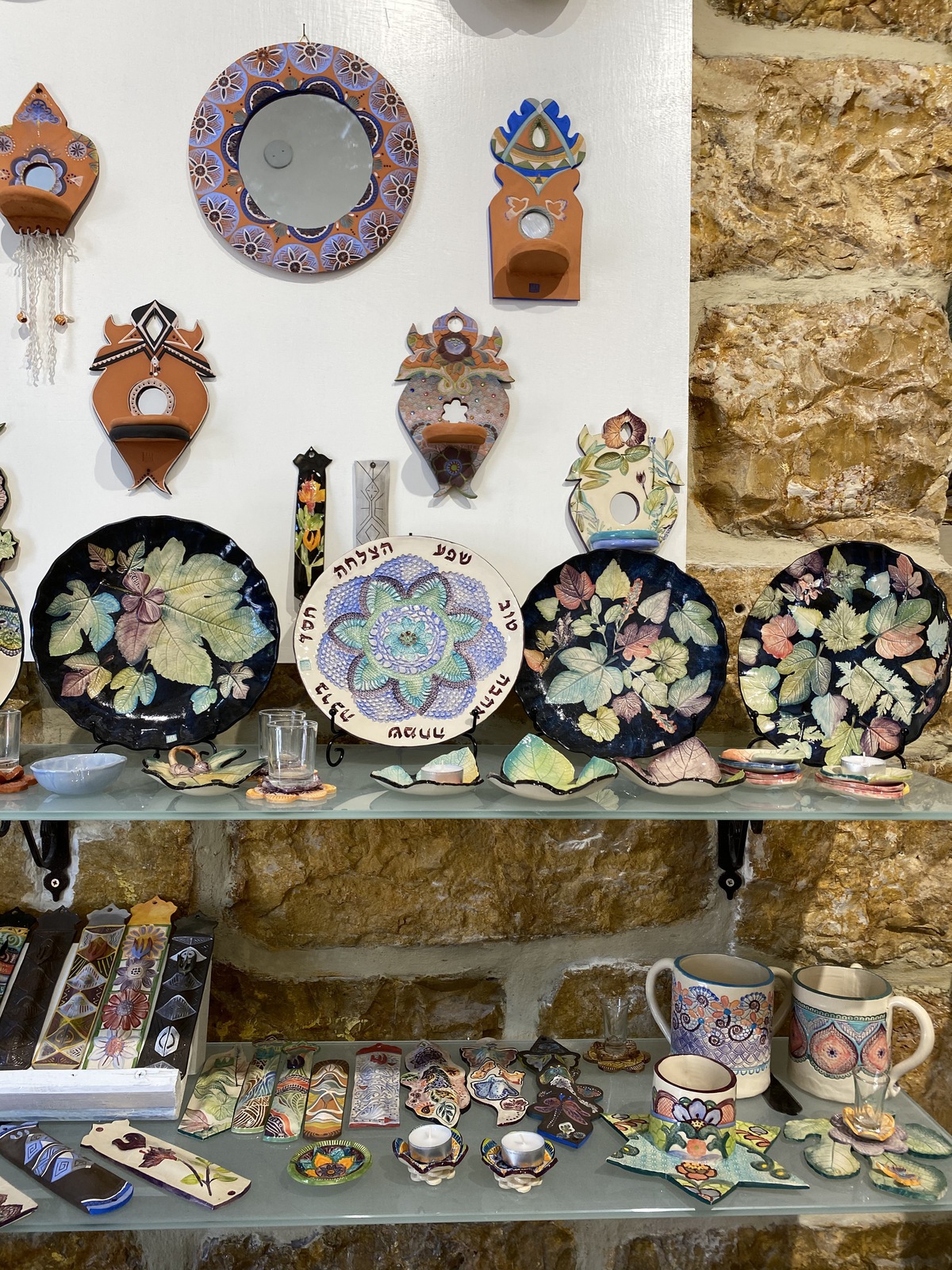 The shop carries colorful jewelry and ceramics made by its proprietors, as well as natural cosmetics, soaps and knitted dolls crafted by Ein Karem artisans.