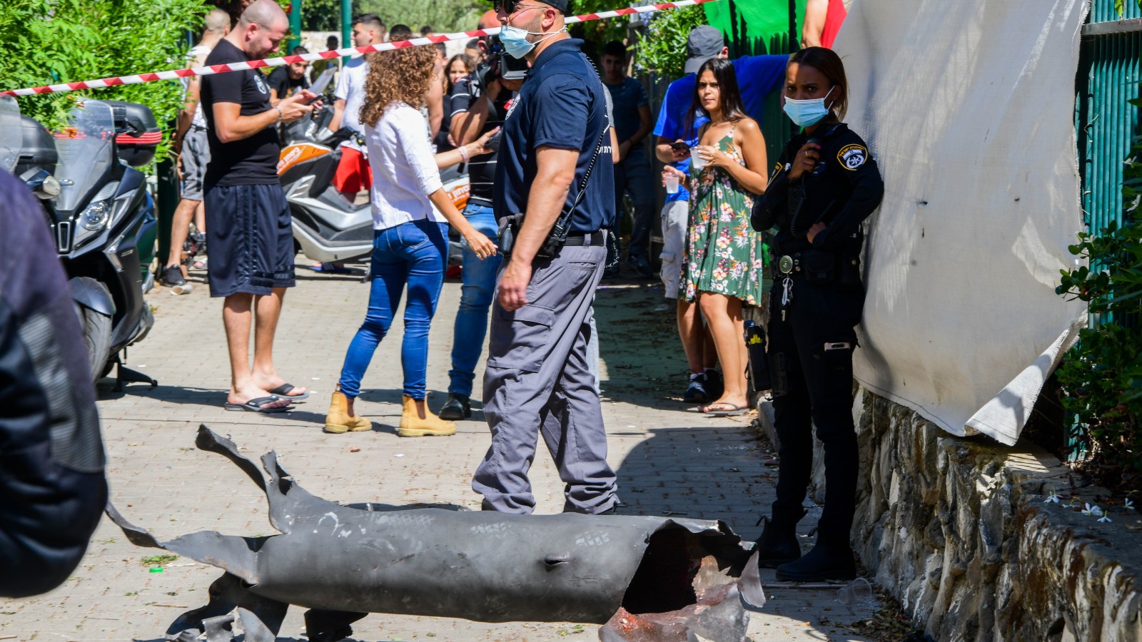 Israeli security forces at the scene where a fragment of a rocket fired from the Gaza Strip landed in South Tel Aviv, on May 13, 2021. Photo by Avshalom Sassoni/Flash90