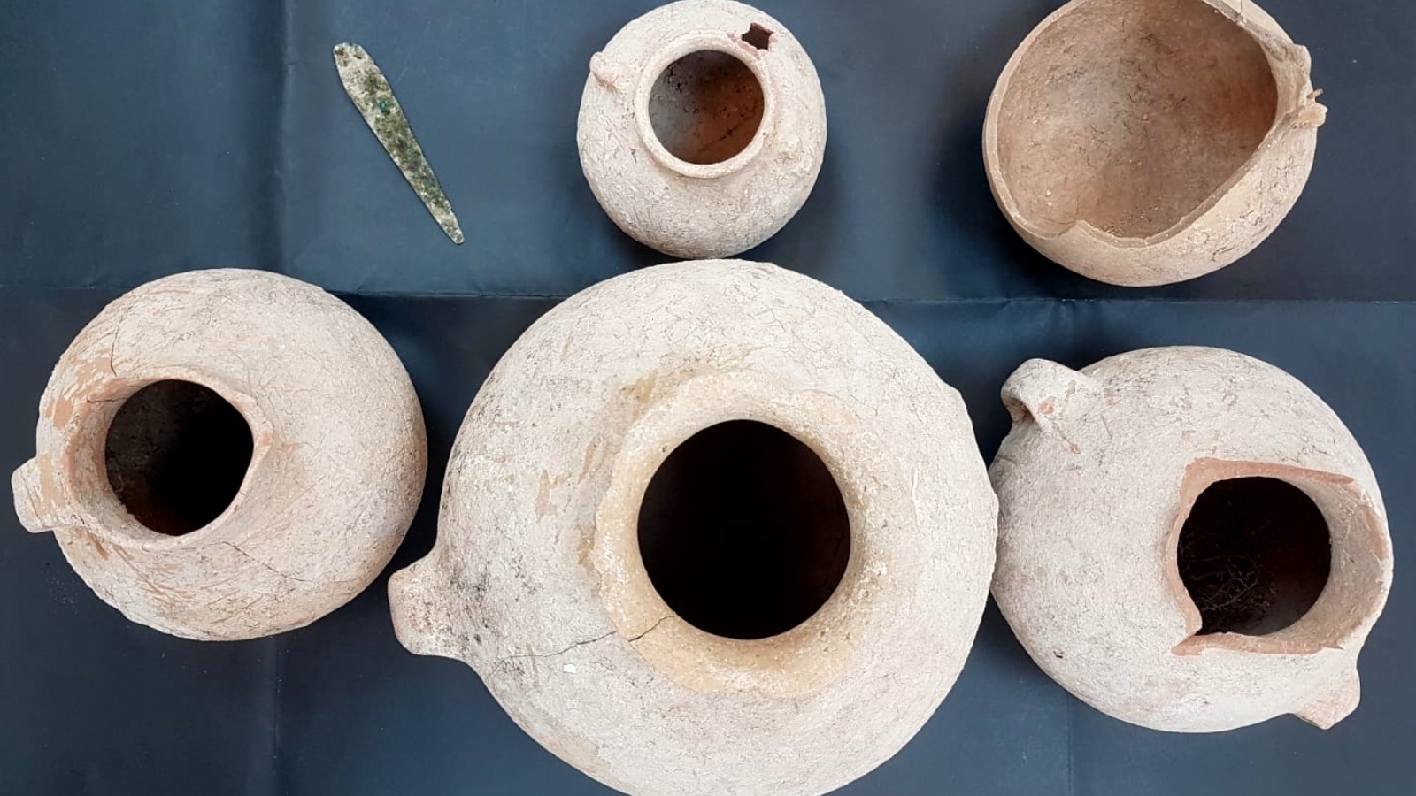 As he leaned against the mountain ridge, the rock crumbled, exposing ancient-looking storage jars and pouring vessels as well as a copper dagger blade previously attached to a wooden handle with nails.