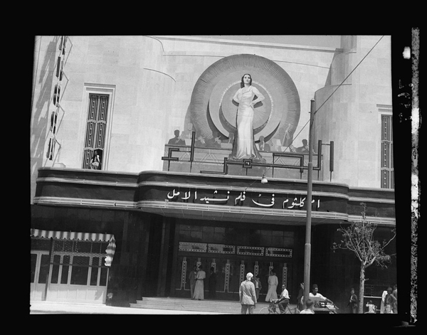 A photo from the British Mandate period shows Kalthoum’s likeness above the entrance to Jaffa’s famed Alhambra Theater where she performed in 1937. (The building today houses Israel’s Scientology Center).