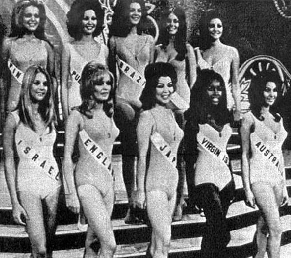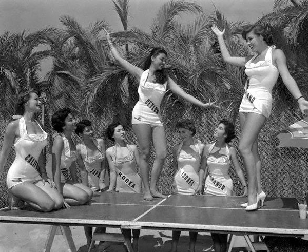 How different from the 1955 Miss World contest, when Miss Israel Ilana Carmel and Miss Lebanon Hanya Bedoun were able to link arms without controversy, while Miss Ceylon (now Sri Lanka) Maureen Hingert did a table-tennis-tabletop dance with Miss England Margaret Rowe.