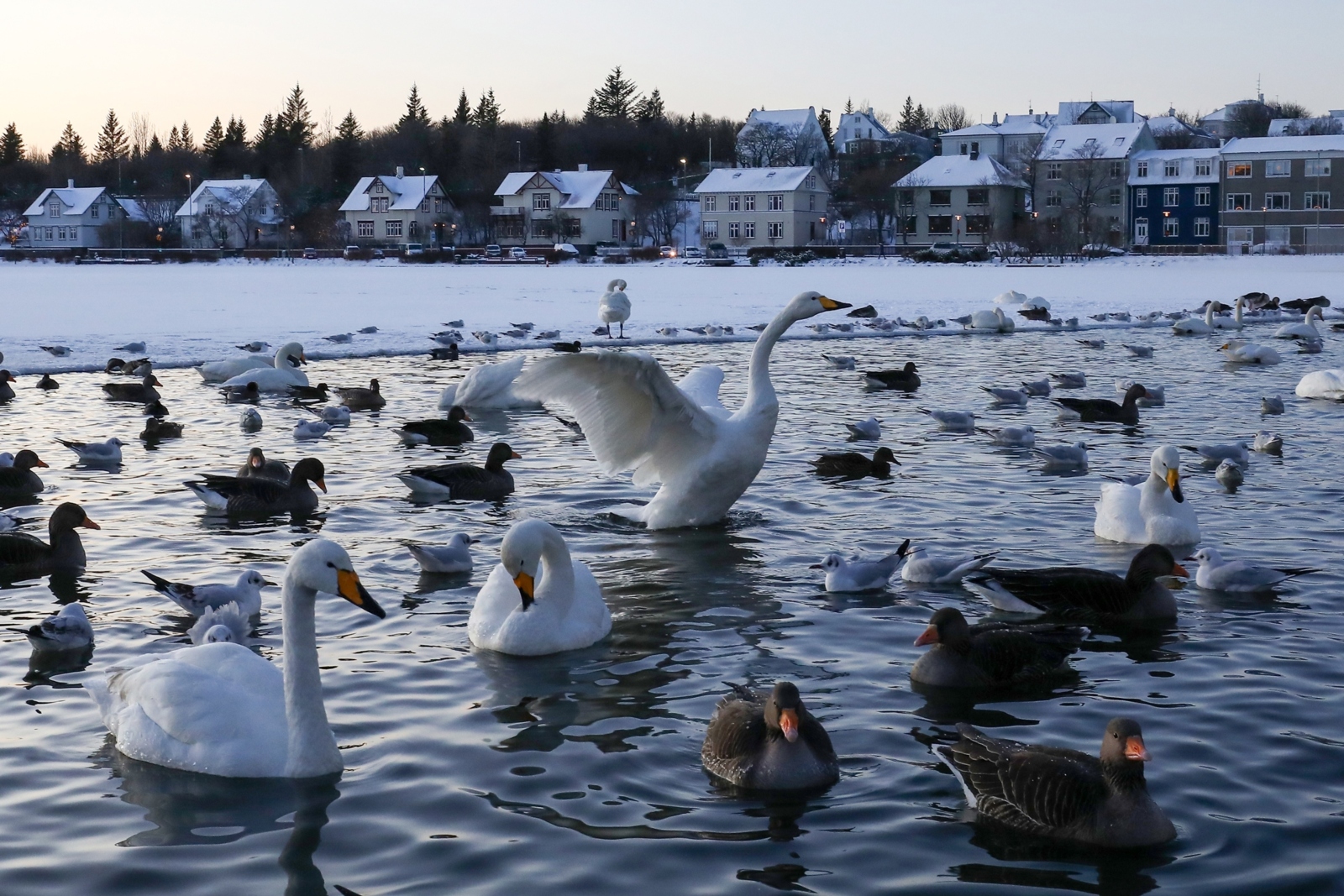 Dozens of swans, ducks and other water birds crowd into a small area of a freshwater lake which had almost completely frozen over in Reykjavik, Iceland. Photo by Ilan Rogers