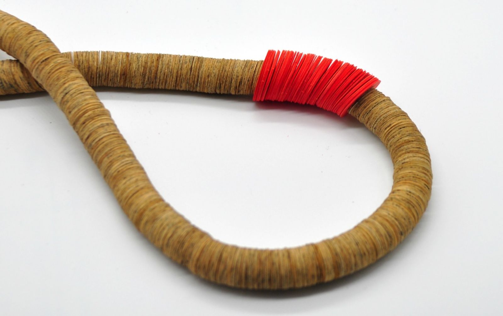 Klein’s one-of-a-kind necklaces, bracelets and earrings are fashioned by cutting pages into little round or oval-shaped discs and stringing them together on leather string alongside colorful, often recycled, paper and a few beads.
