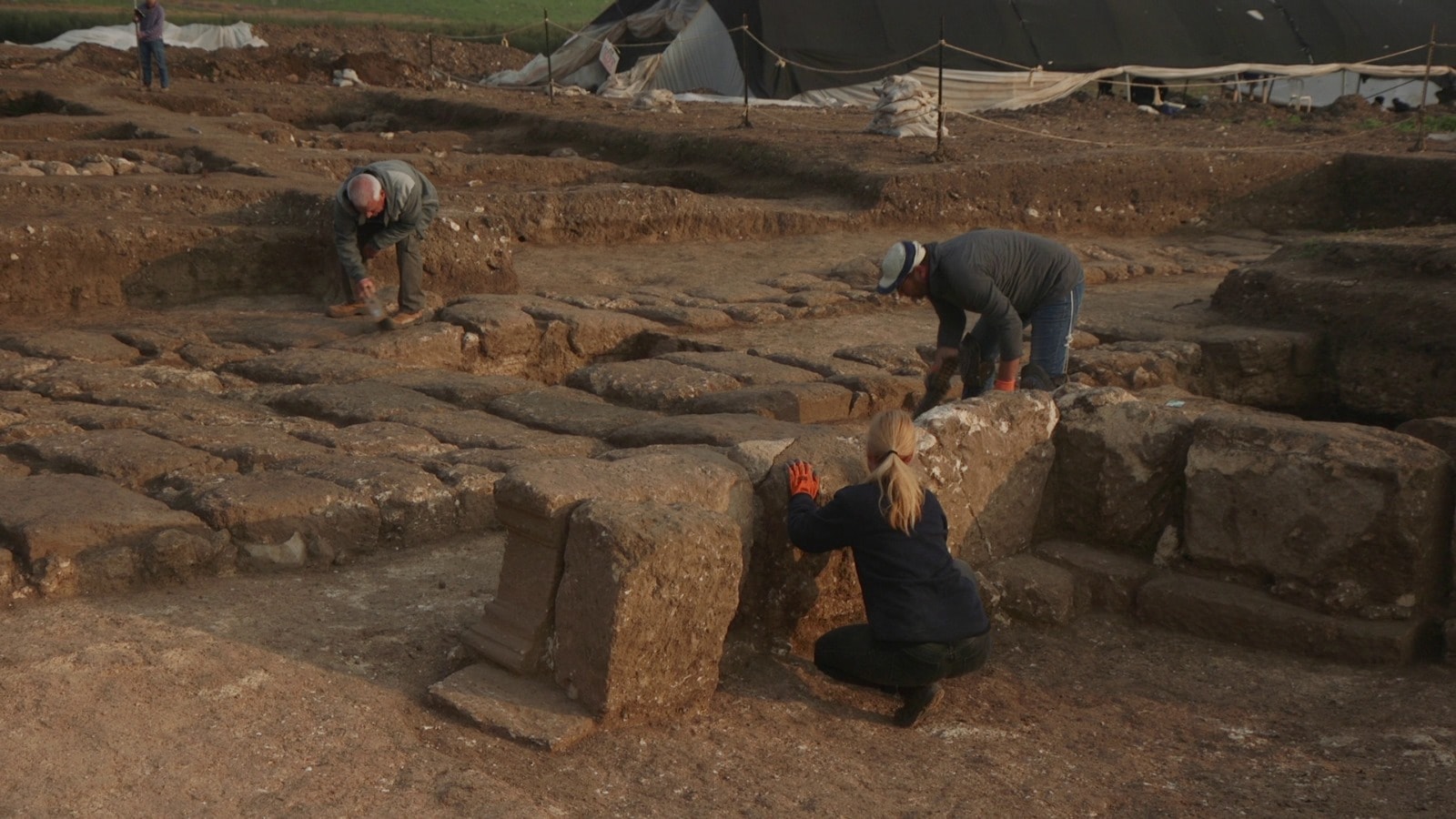 Remains of the 12 meter-wide Via Pretoria (the main road of the camp) were uncovered, as well as a semicircular-shaped podium and stone-paved areas which were part of a large public building.