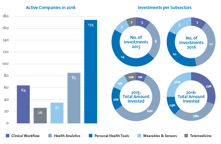 Another subsector that received considerable funding in 2016 ($55 million) is clinical workflow, which includes companies that enable hospitals, clinics, labs and other healthcare stakeholders to work more efficiently. The wearables and sensors subsector received $46 million (25% of total investments) in 2016.