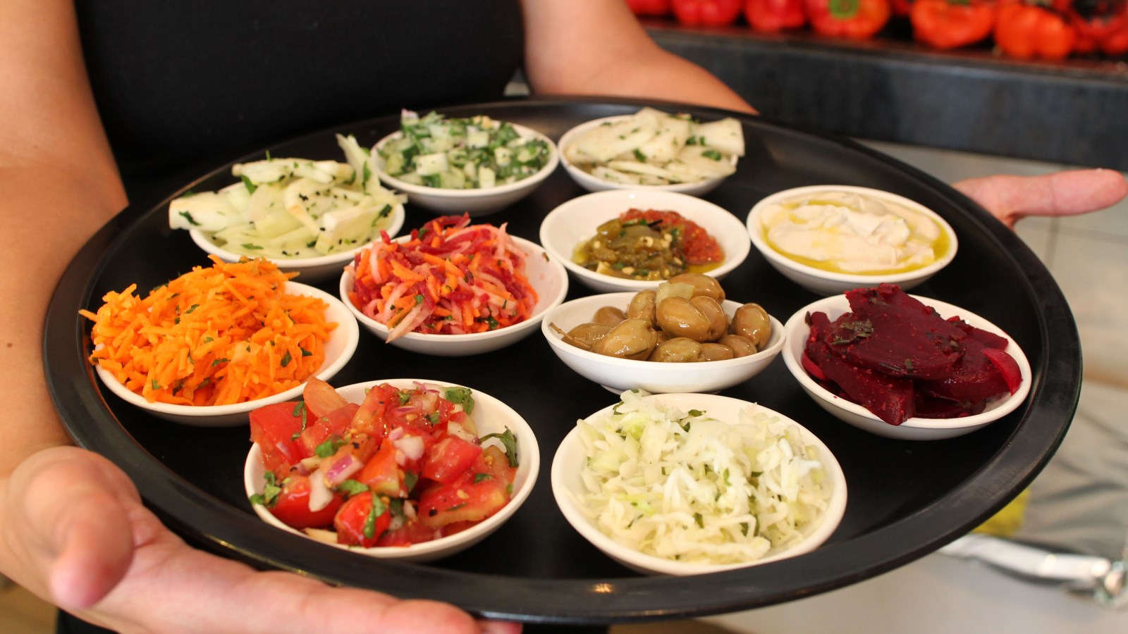 Salads served in Machane Yehuda restaurant. Photo by Nati Shohat/FLASH90