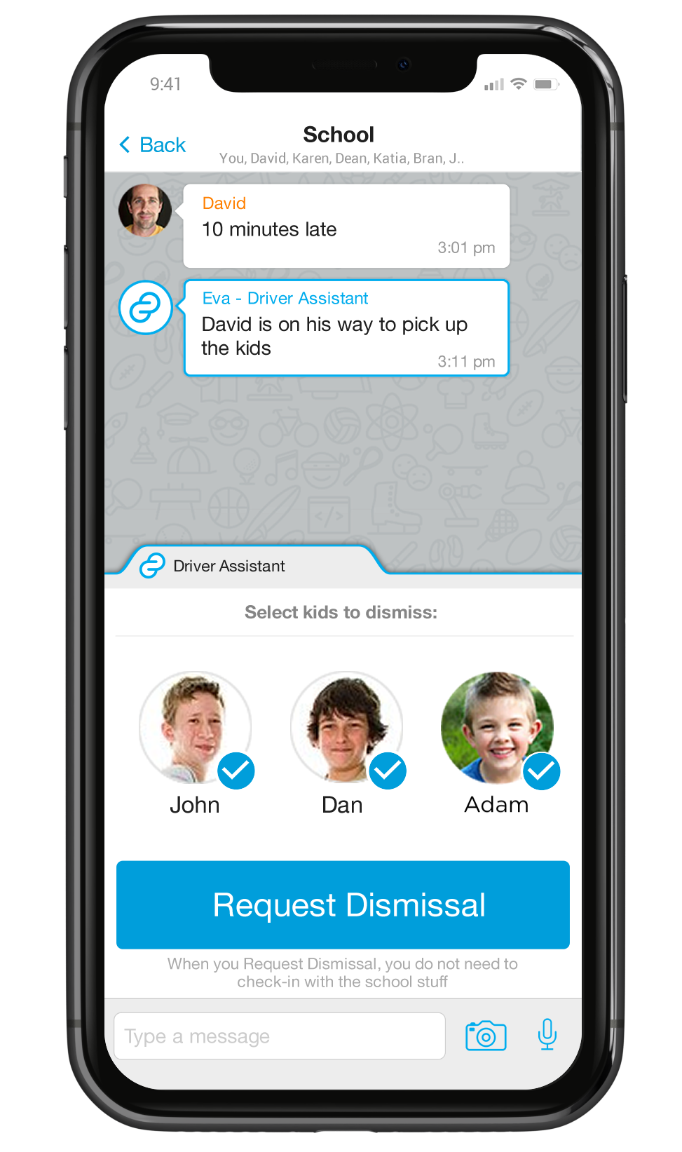 “A parent arrives ready to pick up six children to transport to dance practice,” he explains. “I reach for the dismissal card on the dashboard of the van, bring a walkie-talkie to my mouth and say, ‘Grade 3, please send Isaac S.’”