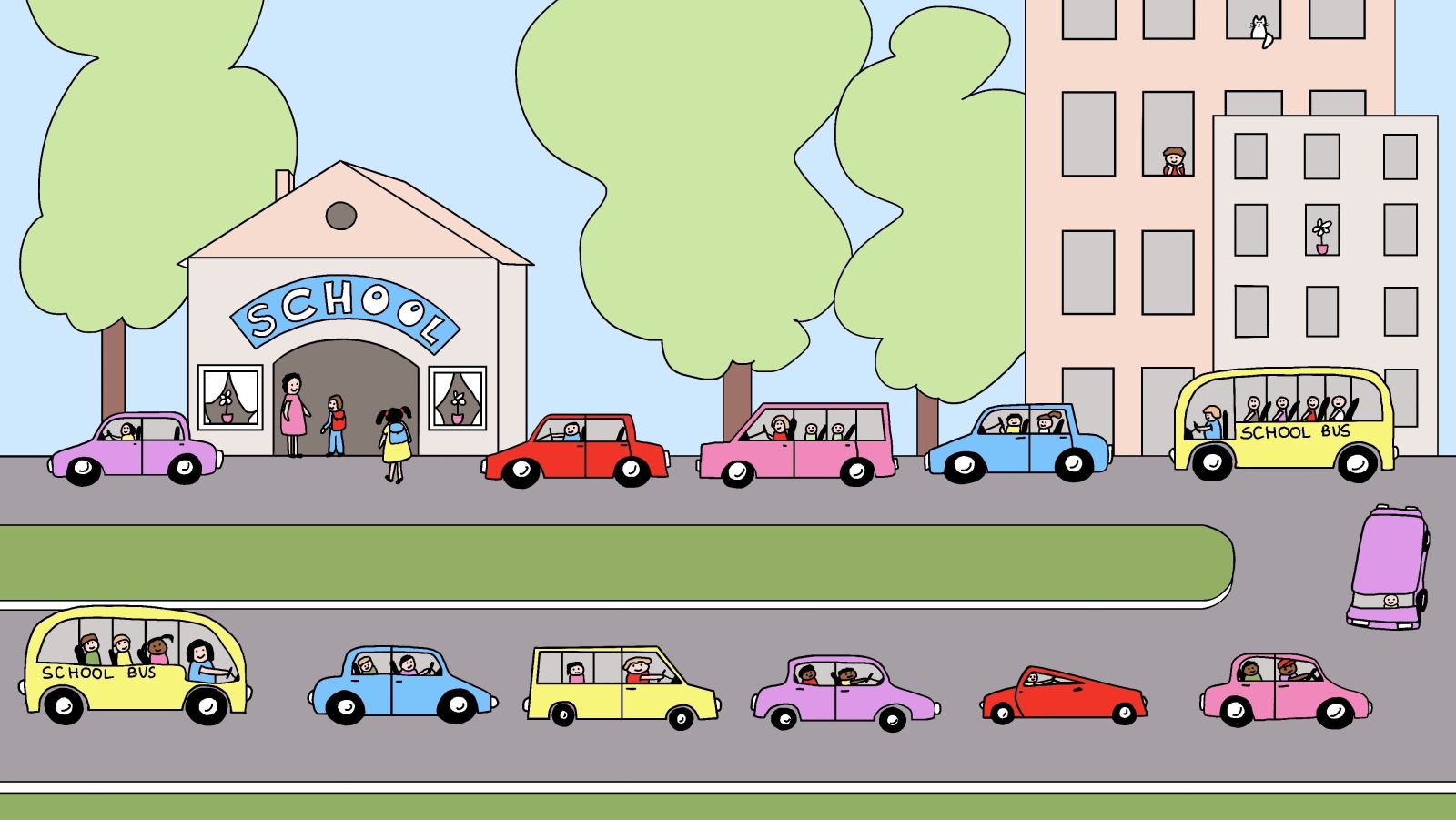 As this slow process drags on one child at a time, the residential roads leading to the school become a congested parking lot full of idling engines.