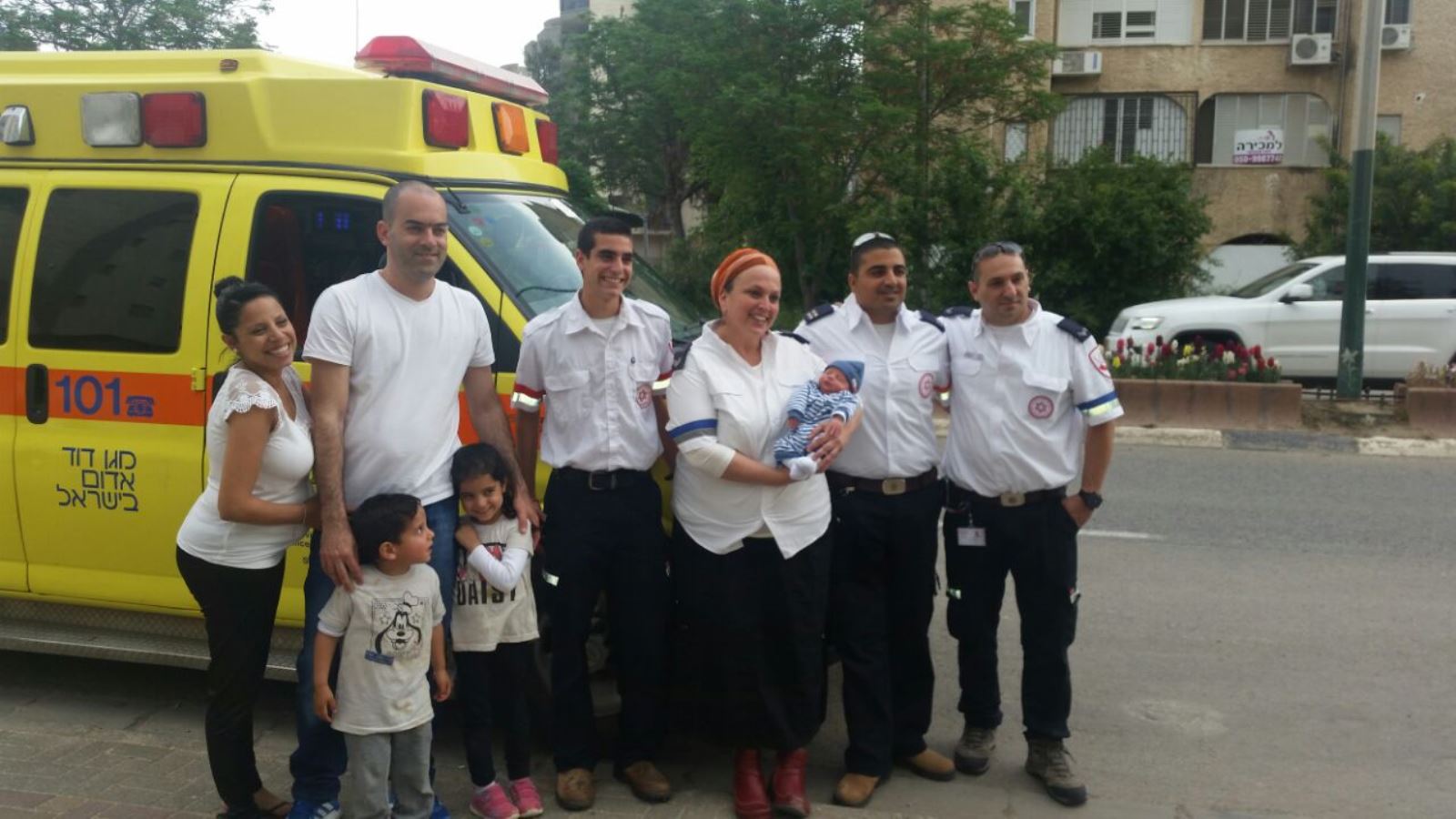 From left, the Sabag family with the crew that delivered their newest addition: Adi Rachamim, Orit Ochana, Nati Liani and Yossi Akris. Photo by MDA Spokesman