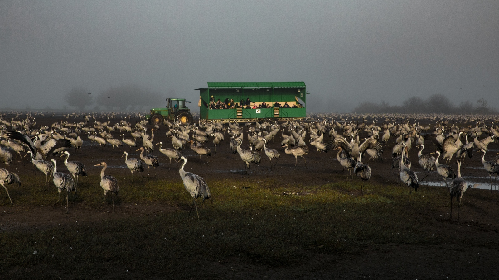Here, tens of thousands of common cranes touch down in the fields every day for a noisy meal to fuel their long journey.