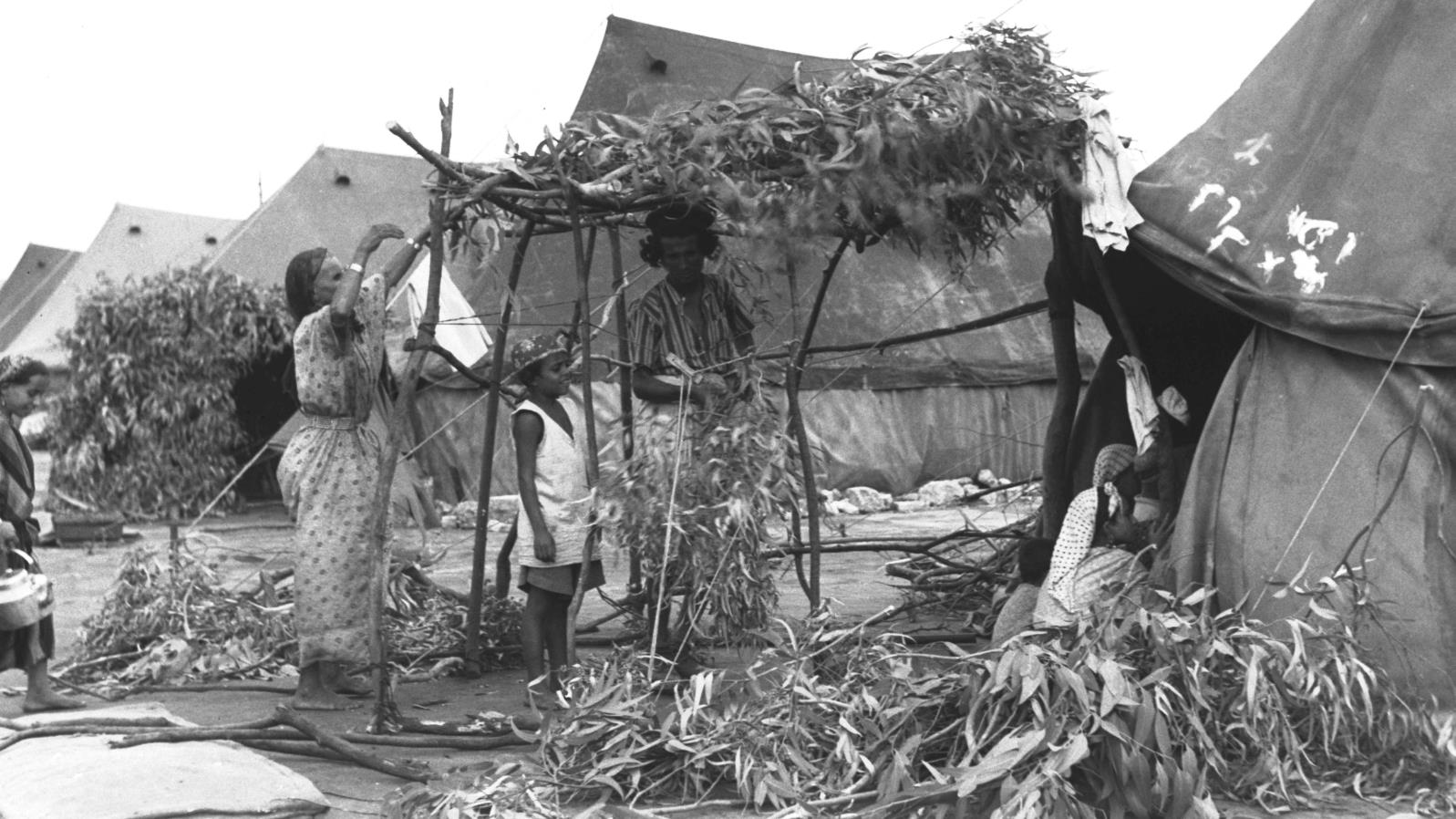 Sukkot at the Sha’ar Menashe ma’abara (new immigrant tent city), 1950. Photo courtesy of GPO