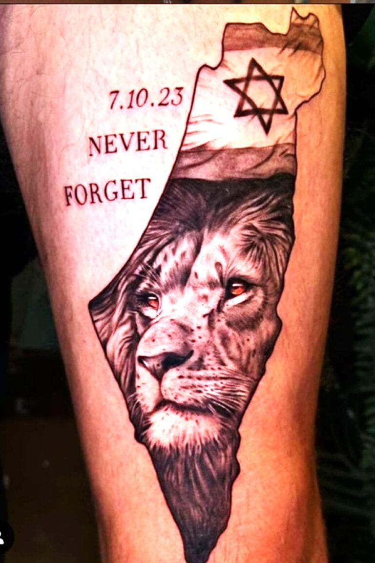 Other tattoos include maps of Israel and evoke themes of strength, courage and connection to the tribe, whether the tribe of Judah or the Israel Defense Forces. Many also include images of war or the tragic Supernova music festival.