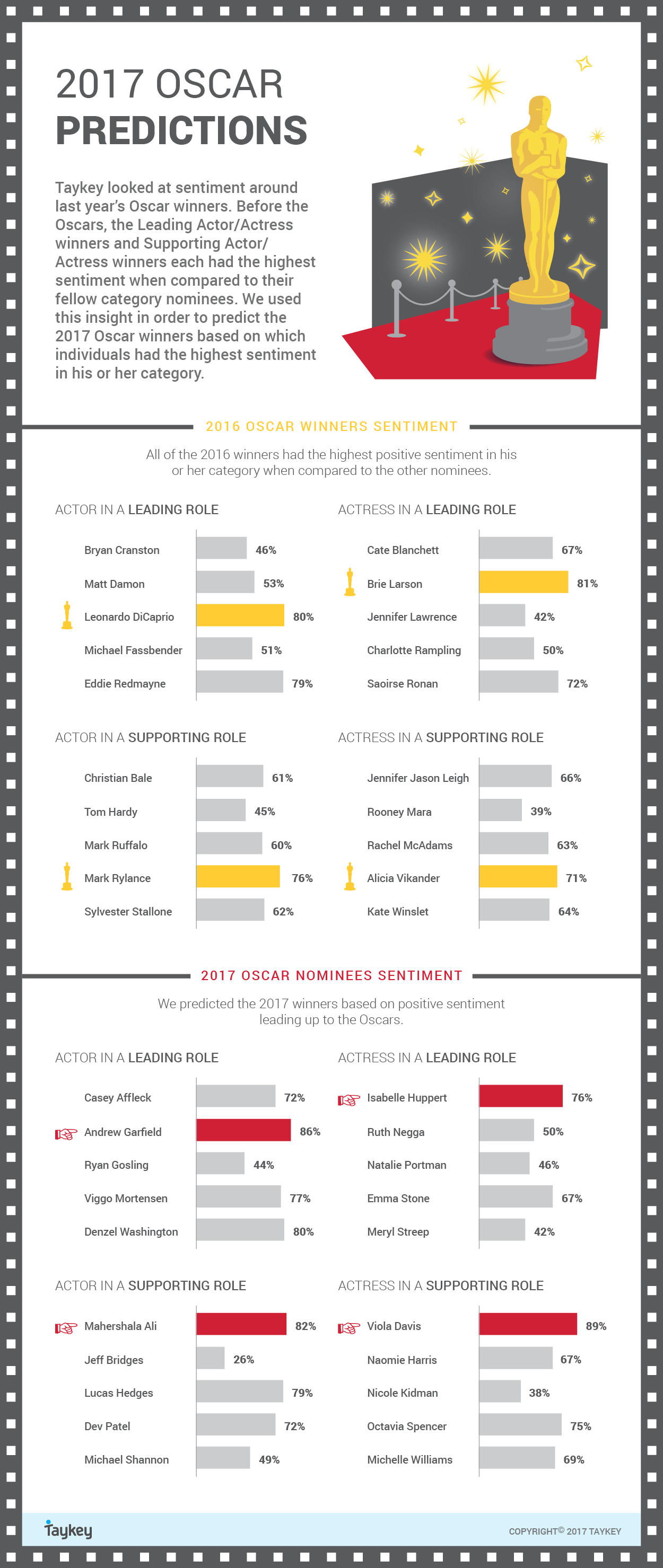 According to Taykey, Garfield has 86 percent positive sentiment leading up to the awards while Huppert has 76% positive sentiment, edging La La Land’s Emma Stone (67% positive sentiment).