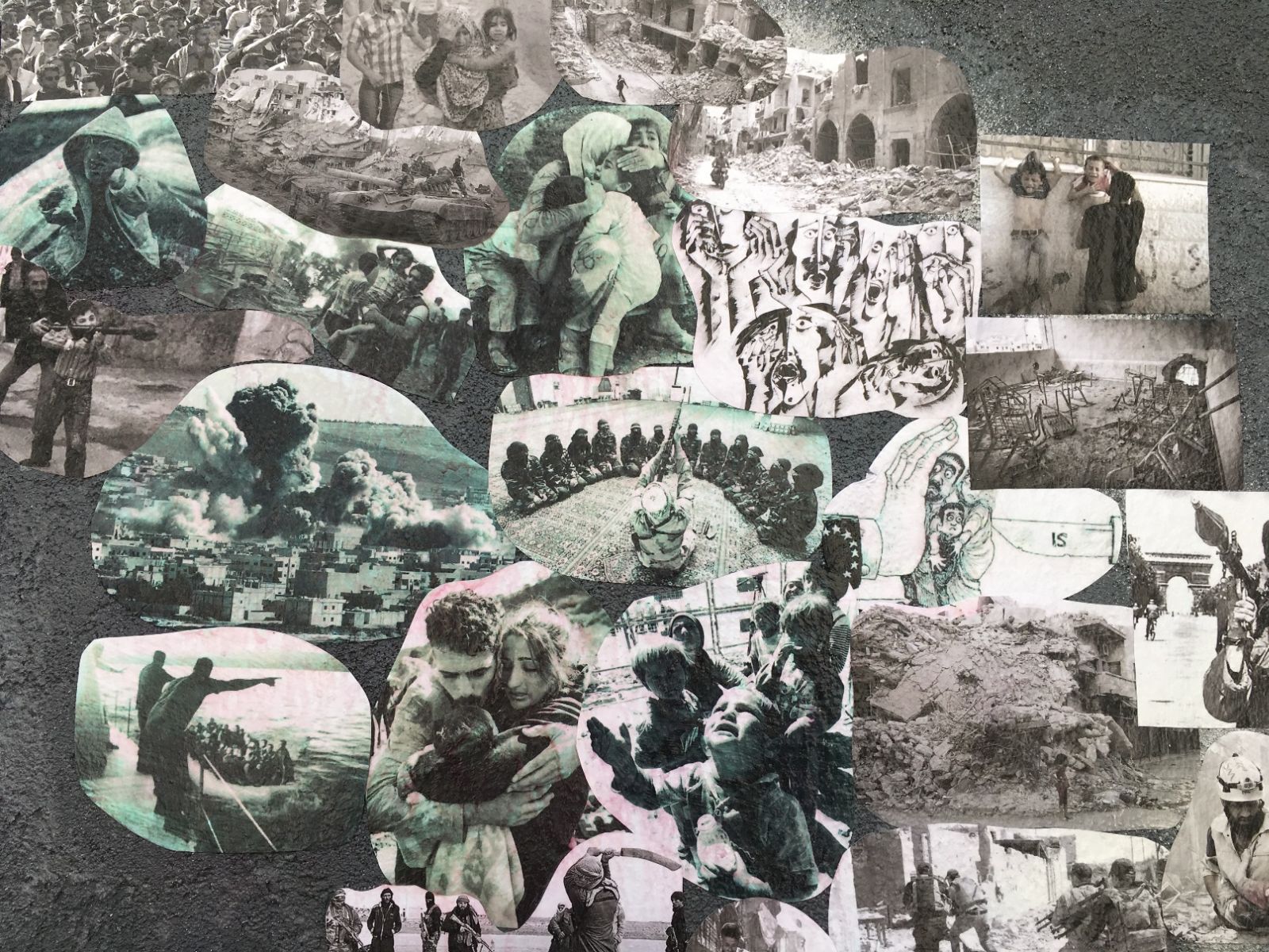 The second in her Refugees series has a picture of a Syrian girl holding her little brother, with black-and-white images from the destruction of their homeland behind them and bright travel posters of Europe in their future.