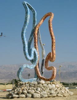 Rising dramatically above the Dead Sea in Ein Tamar, the first mosaic sculpture by modernist artist Jo Jo Ohayon incorporates materials he collected in Tel Aviv, Beersheva and Haifa. He says he chose this medium “because I can use many colors and it will last outside for 1,000 years under the sun. No other material will last like that.”