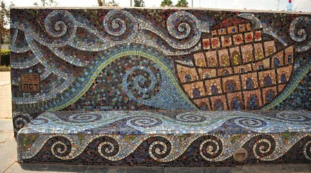 Yoav Dassa’s 18-meter-long sitting area in Ganei Tikvah uses a ceramic tile and natural stone mosaic to depict scenes from the Noah’s ark narrative. Dassa also worked with residents of Ahava Children and Youth Village in Kiryat Bialik to create several mosaic mirrors that now hang throughout the refuge for abused children.