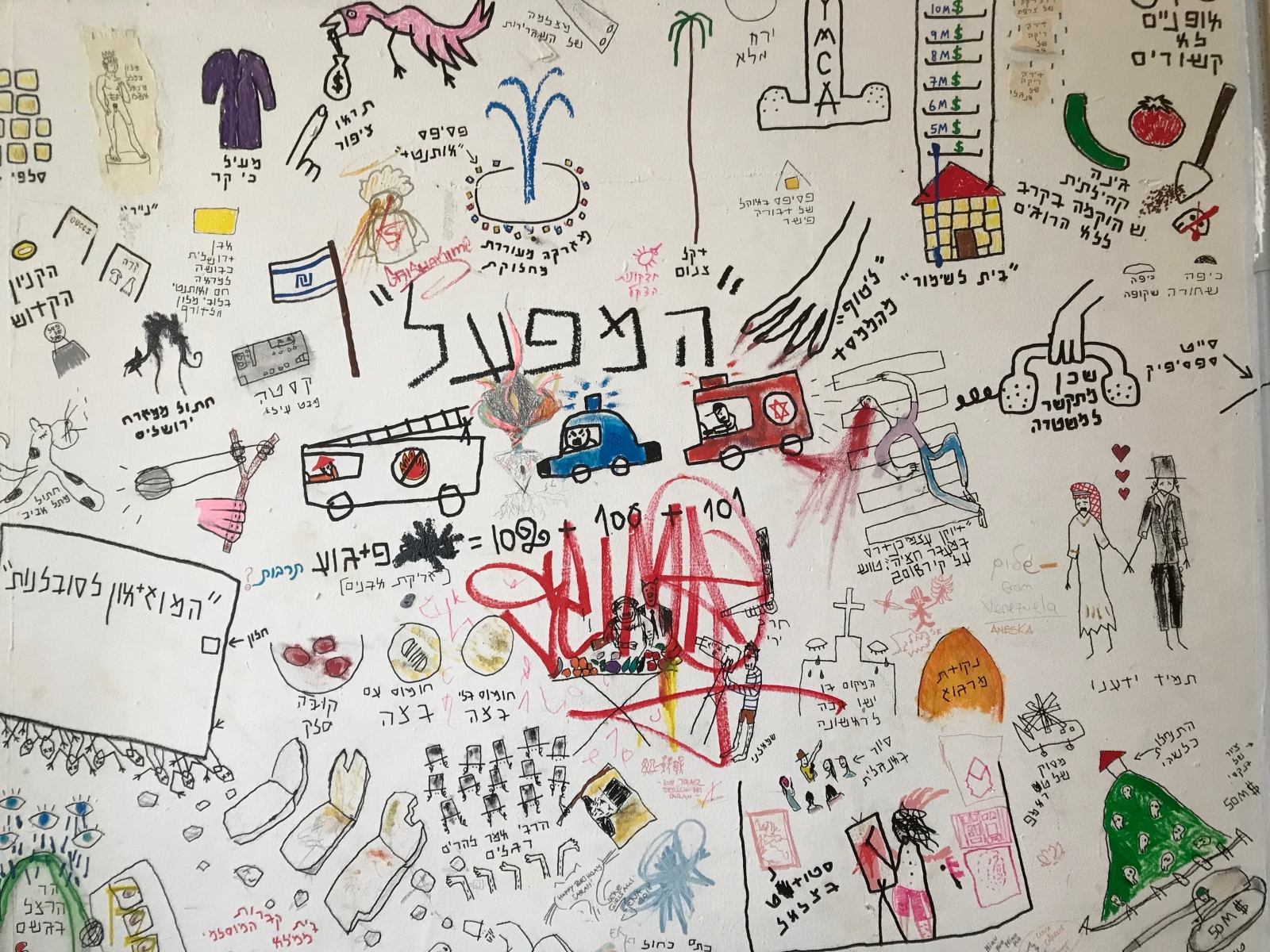 The building is not visible from busy Agron Street, as it’s located in a little lane off Agron behind the Waldorf Astoria Hotel. But tourists from the area’s large cluster of hotels find their way here and mingle with Israelis admiring the creativity. Finding an English-speaker to show you around is never a problem.