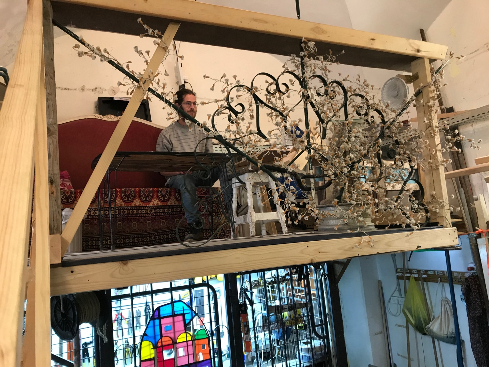 Materials including salvaged items from tear-downs – such as old window frames — are scattered around the space waiting to find new life in an artwork.