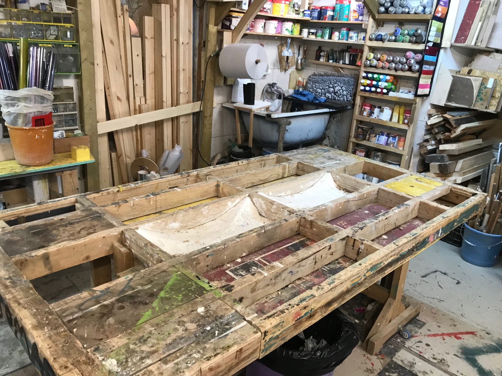Because the gallery also encourages active creation of art, it includes a workshop filled with tools and a huge homemade worktable.