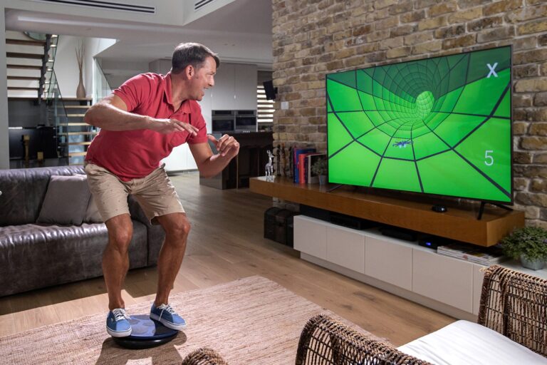 “Research shows that engagement levels go up when you play games, because you don’t feel that you’re working hard. When I stand on a balance board and I’m playing, I’ll be working on balance areas without getting bored,” he says.