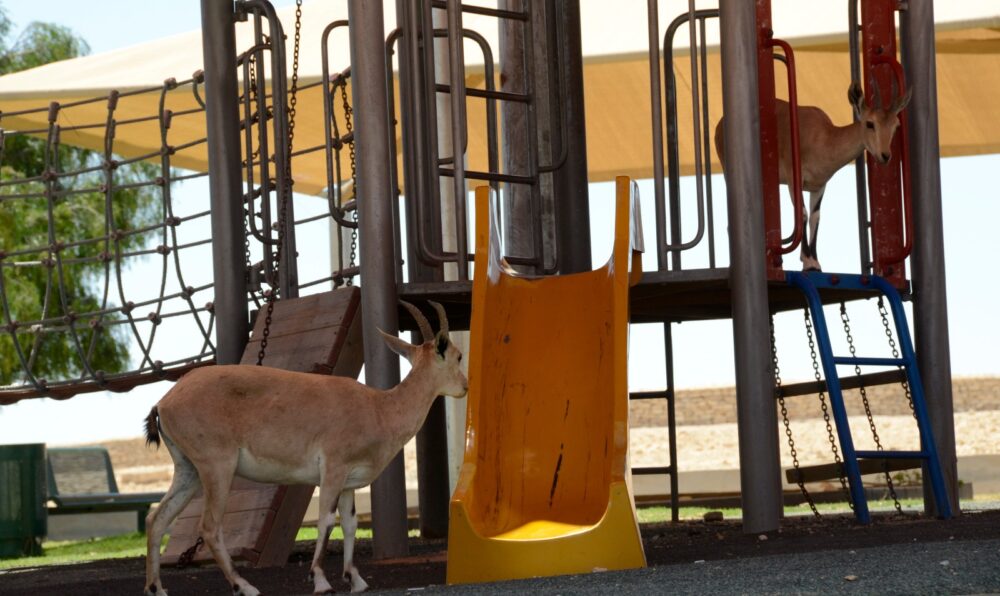 An ibex and its young adventure on a playground in Mitzpeh Ramon. Photo by Zoe Vayer/Flash90