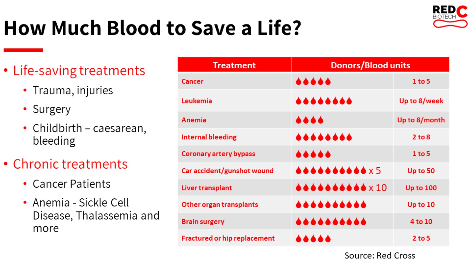 Liver transplants require up to 100 blood transfusions. Some people require red blood cell transfusions on a regular basis, for instance for sickle cell disease or thalassemia.