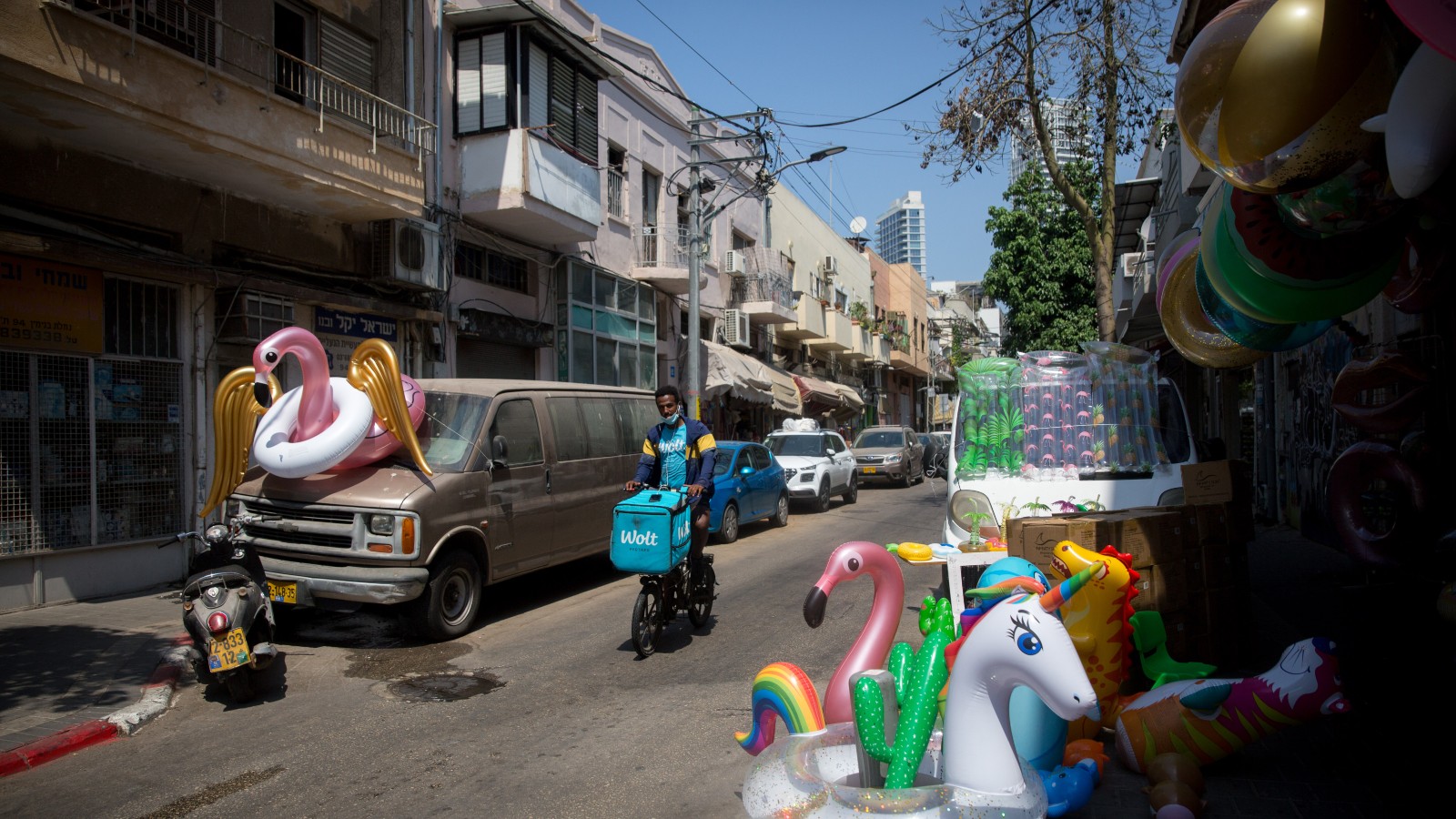 A Wolt deliveryman makes his way down the streets of Florentin, Tel Aviv. Photo by Miriam Alster/FLASH90