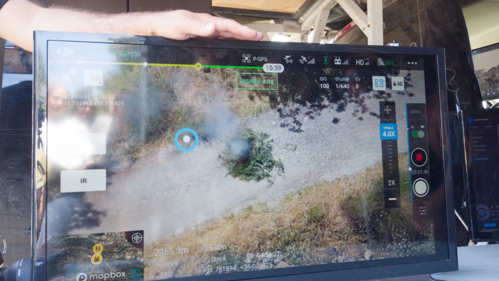 Rami Zaritzky instructs a colleague waiting on the hill opposite to light a controlled fire. Toren, the mounted thermal camera, picks it up immediately and deploys the drone to investigate.