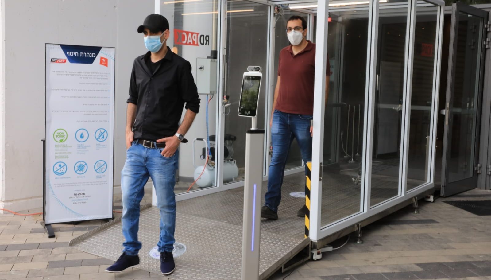 Sanitation tunnel that mists incomers with disinfectant solution being piloted at Tel Aviv’s Bloomfield Stadium.