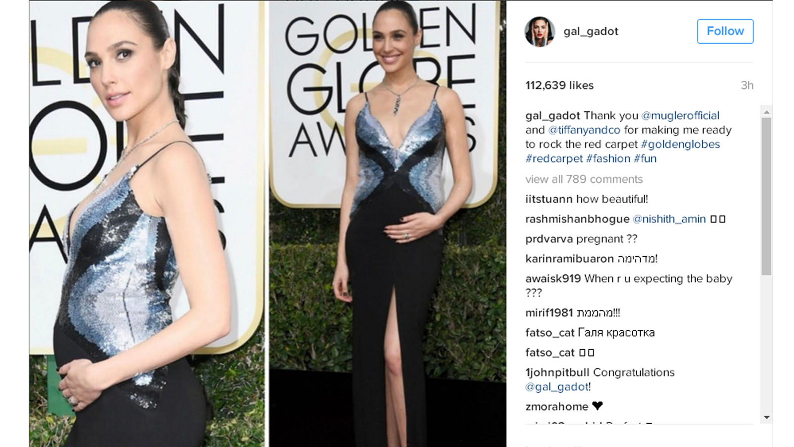 Billboards abuzz with Gal Gadot baby bump Israel’s Wonder Woman glows on the red carpet at the Golden Globes 2017 awards.