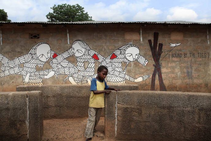 “They each stay here a week or two in residency and create a unique site-specific installation. They visit and get the vibe; then they paint on one of the outer walls and also do an indoor exhibition or installation. We give them a team of people to help them do whatever they want technically.”