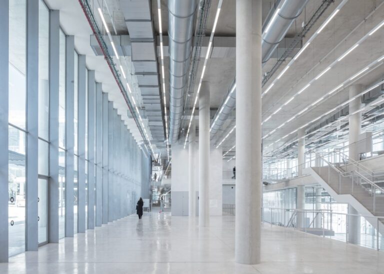 The campus is nearly 43,000 square meters, though it doesn’t give that impression. The choice of glass for most of the building façade and for the classrooms, exhibits and hallways is deliberate, making almost the entire school visible from the outside and enabling students to interact with their surroundings in a far more intimate way.
