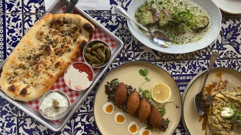 Try the chicken muhamar – a dish baked like a pizza with sumac, onions, tahini, tomatoes and chicken thighs — or the kebabs baked in bread. And don’t miss the restaurant’s signature dessert, fattoum, a vanilla parfait served with roasted katayef noodles, pistachio and a salty toffee sauce. Mmm.