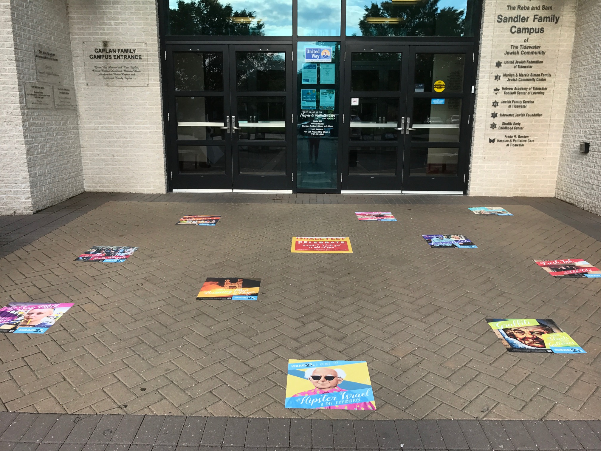 Images from “The Guide to Hipster Israel” were printed on 18-by-18-inch sidewalk stickers and placed at the front entrance of the Simon Family JCC on the Reba and Sam Sandler Family Campus of the Tidewater Jewish Community.