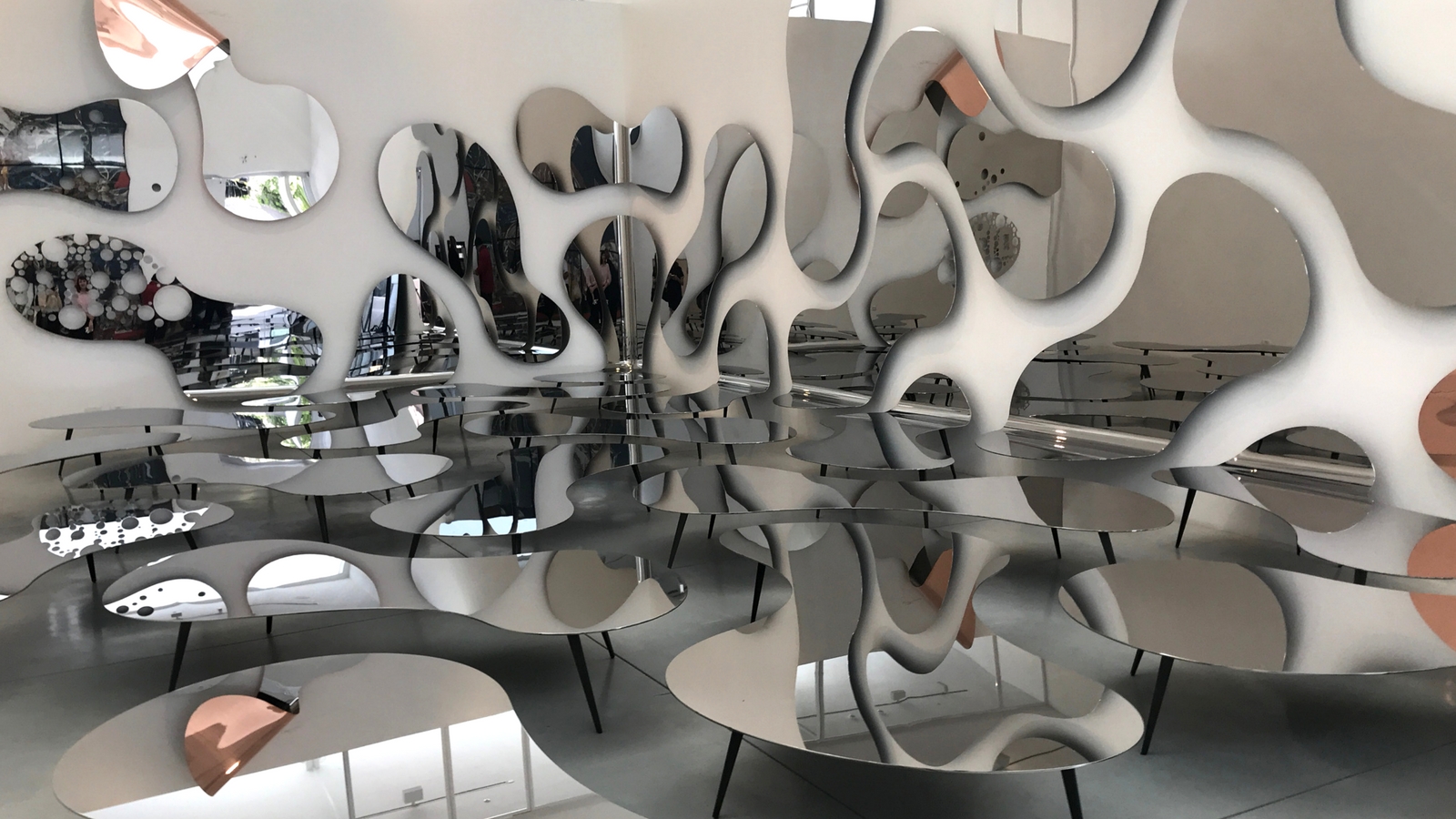 The exhibition is centered on 32 irregularly shaped, stainless steel tables arranged throughout the gallery space. Some of the mirror-polished tables stand on four legs while others are carefully curved around corners and mounted to the wall, allowing gallery-goers to weave through the space and catch reflections from every angle.