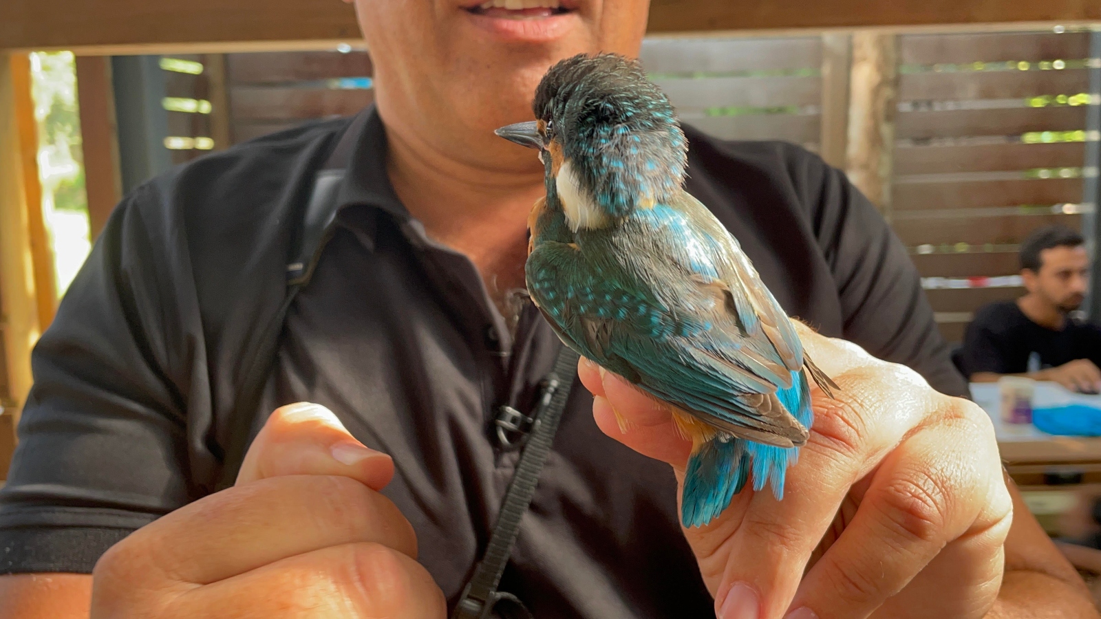 Ornithologist Yaron Charka holding a kingfisher (shaldag, in Hebrew) at Rosh Tzipor Birdwatching Center in Tel Aviv. Photo by Natalie Selvin